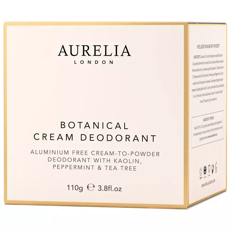 Aurelia Botanical Cream Deodorant er en fuldstændig fantastisk deodorant. Dette er en anderledes deodorant, da den fungerer som en creme-til-pudder deo. Det vil sige at man her får en deodorant i krukke, og når den påføres vil den forvandle sig til pudder. Det superfine pudder som blandt andet indeholder pilerod og kaolin, absorberer naturligt sved i løbef af dagen, og holder derved huden tør. Den er beriget med sheasmør, som fugter huden, mens indholdet af tea tree- eukalyptus- og pebermynteolie virker antiseptisk og antibakteriel, samtidig med at det bidrager til den friske duft. Aurelia Botanical Cream Deodorant fjerner dårlig lugt og efterlader dig med en frisk og ren følelse.