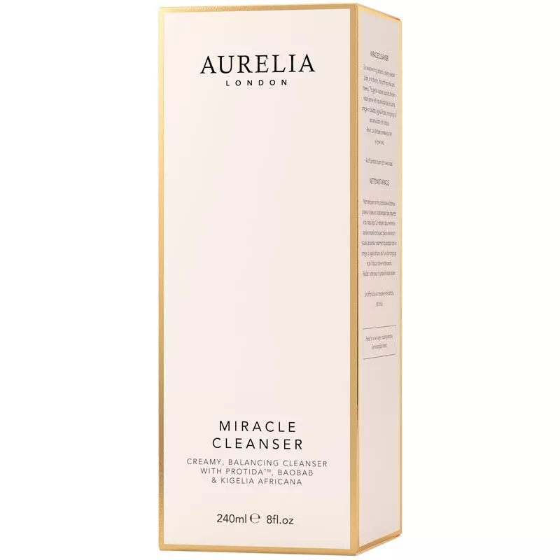 Aurelia Miracle Cleanser er en prisvindende rensecreme. Denne bløde creme glider let over huden, mens den løfter makeup og urenheder fra hudens overflade. Den indeholder en blanding af essentieller olier, som bidrager til den skønne duft af kamille, eukalyptus, bergamotte og rosmarin. Den er beriget med probiotika, som er en mælkesyrebakterie, der giver huden en stærk barriere, og som hjælper huden med at genoprette sig selv. Derfor er den ideel at bruge til alle hudtyper – uanset om man døjer med urenheder, rødme eller dehydrering. Aurelia Miracle Cleanser har en virkelig lækker konsistens, som nærmest smelter på huden, og når man fjerner den med den medfølgende bambus muslin-klud, som giver en smule ekfolierende effekt samtidig.