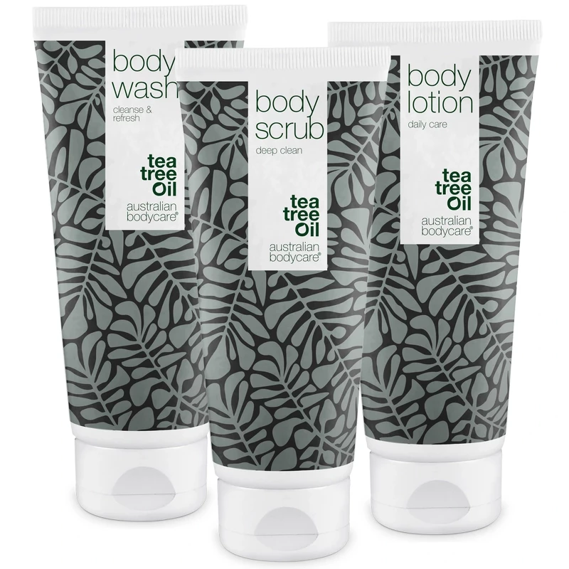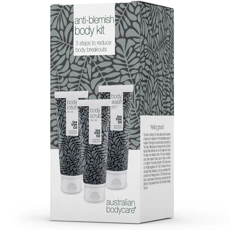 Australian Bodycare Anti-Blemish Body Kit består af en bodywash, scrub og bodylotion, som alle indeholder Tea Tree Oil, der er kendt for sine antibakterielle egenskaber. Dermed kan du både rense, eksfoliere og pleje din krop med disse effektive produkter, ligesom de også hjælper med at reducere udbrud.