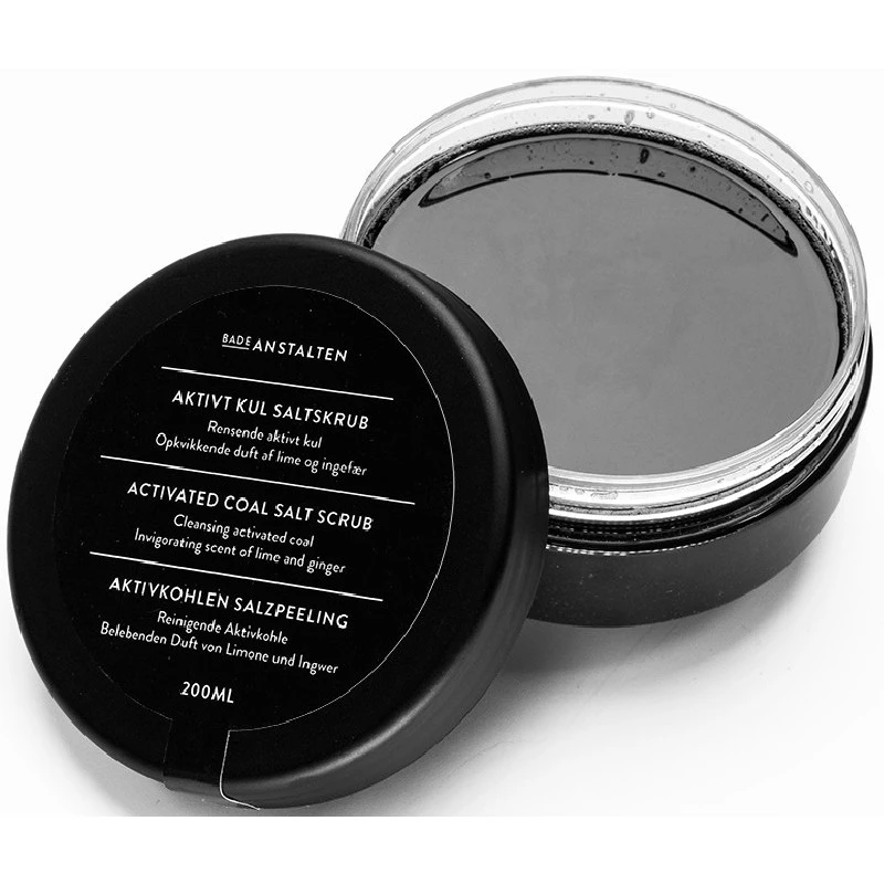 Badeanstalten Aktivt Kul Saltskrub indeholder aktivt kul, der har været behandlet med damp og kuldioxid ved 700-900 grader. Materialet har en mikroporøs struktur og virker rensende. Skrubben har en frisk duft af æterisk lime- og ingefærolie. Skrubbens indhold af havsalt fjerner døde hudceller og stimulerer blodcirkulationen, mens plejende olier fra mandel og raps efterlader huden blød og glat. Det er ren selvforkælelse i en fantastisk flot krukke, der ville klæde ethvert badeværelse. Brug denne skønne bodyscrub til både brusebad og karbad, når både du og huden skal forkæles udover det sædvanlige.