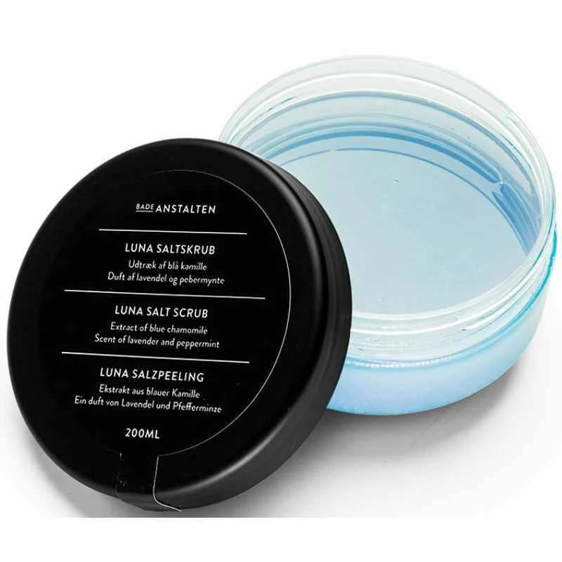 Badeanstalten Luna Saltskrub er en lækker og aromatisk saltskrub med en skøn og beroligende duft af lavendel og pebermynte. Den indeholder havsalt, som fjerner de døde hudceller fra hudens overflade, samtidig med at blodcirkulationen stimuleres. Derudover er den med olie fra mandel og raps, som holder huden blød og glat. Den flotte farve på skrubben kommer fra blå kamille, og dette gør at skrubben får et super lækkert udseende, som vil pynte på ethvert badeværelse. Denne skrub kan både bruges i karbad og brusebad, og er perfekt at bruge, når man synes, at huden trænger til lidt ekstra forkælelse.
