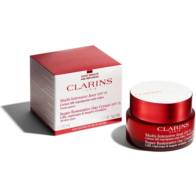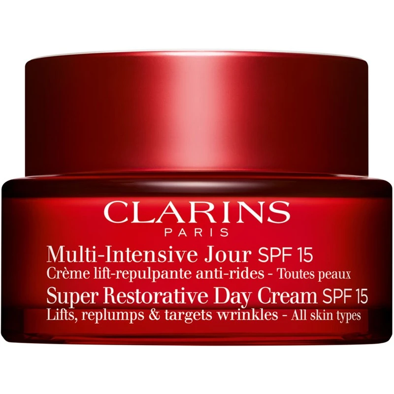 Clarins Super Restorative Day Cream SPF 15 har en all-round anti-age effekt på den modne hud. Takket være en kombination af økologiske ekstrakter fra tornblad og harungana, går denne creme effektivt ind og synligt løfter og opstrammer huden, samt giver den mere fylde og reducerer rynker.