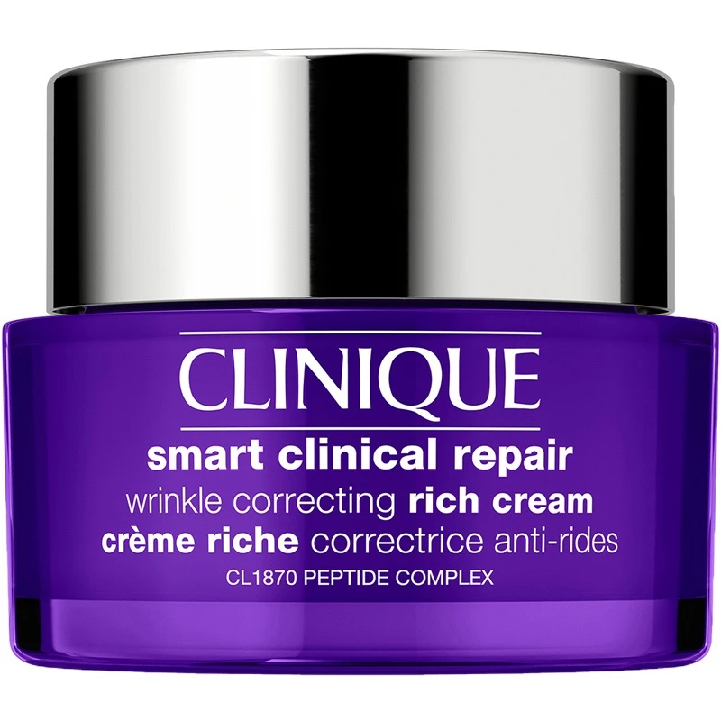 Clinique Smart Clinical Repair Wrinkle Correcting Face Cream Rich er en luksuriøs anti-age creme til tør og meget tør hud, der med sin avancerede formel målrettet bekæmper rynker og fine linjer i ansigtet. Den er beriget med en unik kombination af peptider, kaldet CL1870 Peptide Complex™, der reducerer synlige linjer og rynker ved at stimulere den naturlige kollagenproduktion og styrke hudstrukturerne.