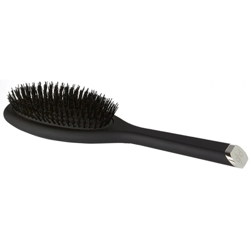 ghd Oval Dressing Brush har et professionelt og stilfuldt design i matsort og krom. Den har ligeledes et lækkert håndtag, der er belagt med en blød og skridsikker overflade, der sikrer dig god kontrol, når du reder dit hår.