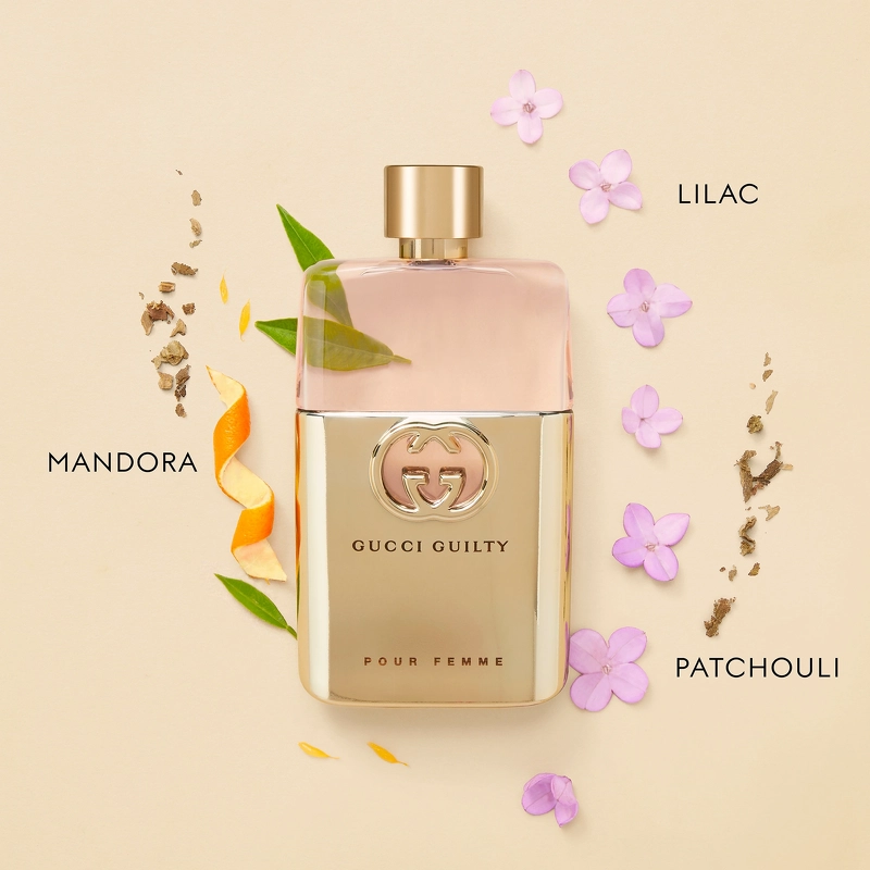 Gucci Guilty Pour Femme EDP er en vidunderlig parfume, til den optimistiske og legesyge kvinde, der sætter pris på hele tilværelsen med er særlig taknemmelighed. Duften åbnes i toppen med syrlig lime, saftig appelsin, og krydret pink peber, der sætter et lækkert og orientalsk præg på hele duften. De næste noter der vil tryllebinde dine sanser kommer fra den store buket blomster, der består af hyacinter, violer, roser og smukke velduftende gerania der får dine tanker ledet hen på den første forårsdag hvor blomsterne begynder at springe ud i fuldt flor. En vidunderlig Eau de Parfum, der på mest delikate vis rundes af i bunden med duften af patchouli og rav, der gør den varm, og får den til at omslutte kroppen på den mest skyldige måde. Et musthave til den rummelige kvinde med respekt for sig selv og sine omgivelser.