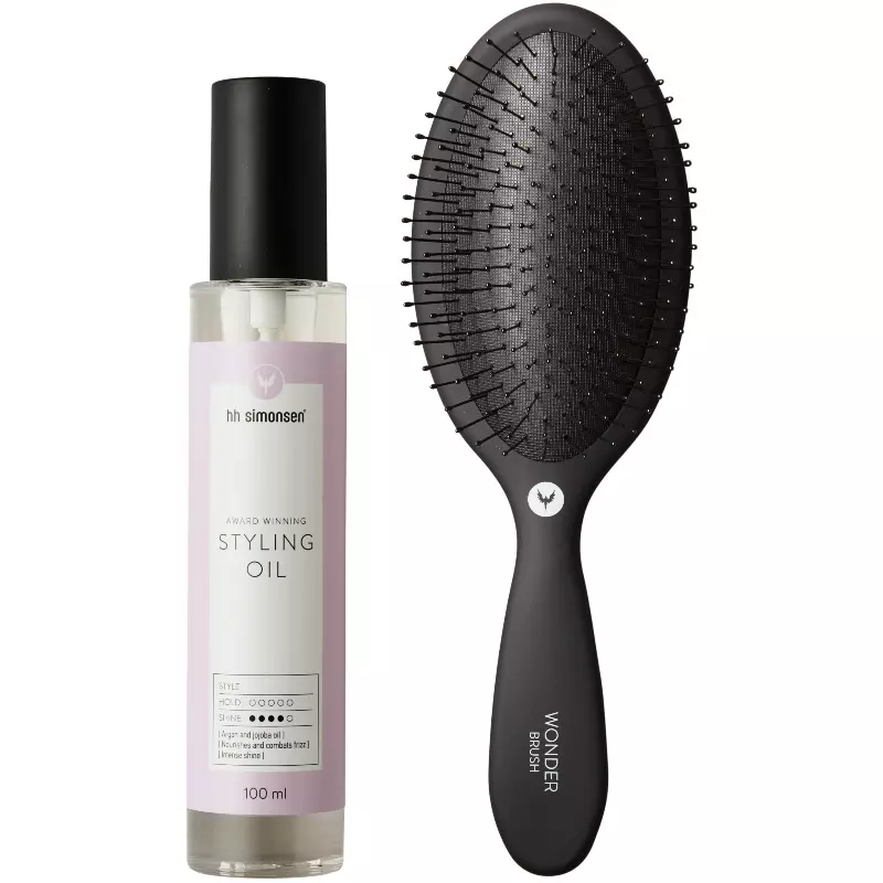 Denne pakke byder på en hårolie med plejende ingredienser, der forkæler dit hår og beskytter det mod varmepåvirkninger fra styling-redskaber. Derudover kan du glæde dig til en utrolig behagelig frisering med den skånsomme hårbørste, som er skabt til at tage sig godt af både hår og hovedbund.