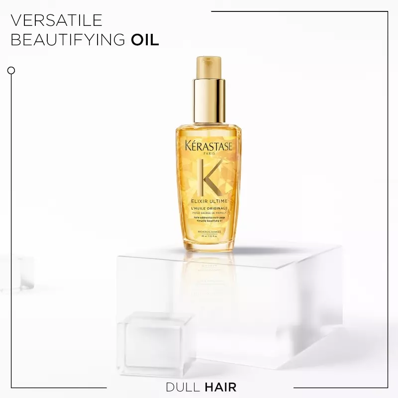 Ligeledes indeholder Kérastase Elixir Ultime L’huile Originale Hair Oil varmebeskyttende ingredienser, som beskytter dit hår ved brug af varmeredskaber som f.eks. glattejern og føntørre.