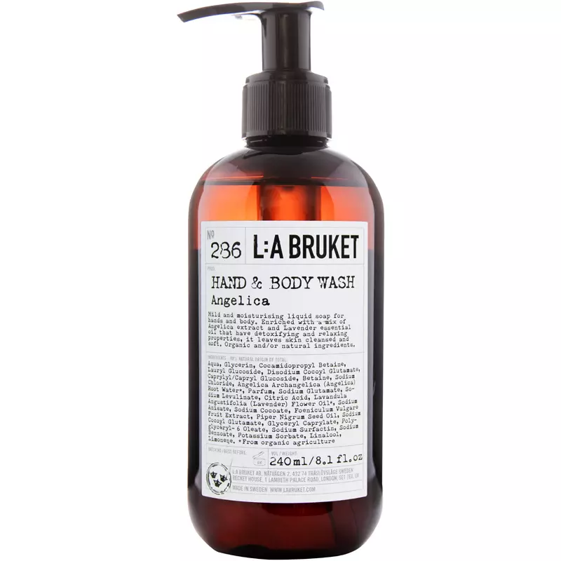 L:A Bruket 286 Hand & Body Wash – Angelica er tilsat æteriske lavendelolie og angelikaekstrakt, som virker beroligende og udrensende på både krop og sind, samtidig med at huden forkæles med dens friske, grønne duft.