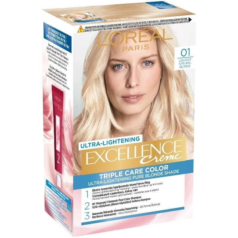 L’Oréal Paris Excellence 01 Ekstra Lysblond Naturlig er en permanent hårfarve der er specielt udviklet til, at dække grå hår 100%. Den indeholder Triple Care teknologi, der ved hjælp af Pro-Keratin, Ceramide og Ionéne G komplekser, beskytter før, under og efter hårfarvningen. Dette sikrer en perfekt dækning, samt et glansfuldt og holdbart resultat.