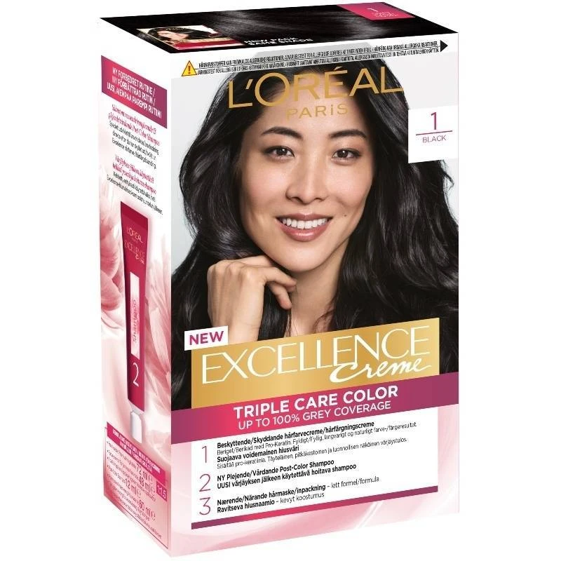 L’Oréal Paris Excellence 1 Sort er en permanent sort hårfarve der er specielt udviklet til, at dække grå hår 100%. Den indeholder Triple Care teknologi, der ved hjælp af Pro-Keratin, Ceramide og Ionéne G komplekser, beskytter før, under og efter hårfarvningen. Dette sikrer en perfekt dækning, samt et glansfuldt og holdbart resultat. Denne nuance anbefales til sort, mørkebrunt og brunt hår.