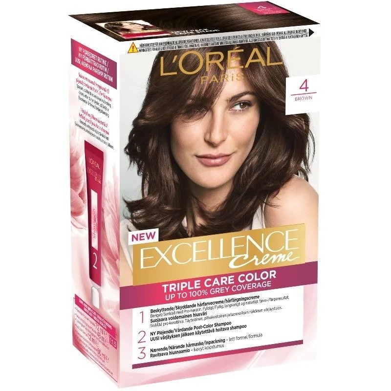 L’Oréal Paris Excellence 4 Brun er en permanent hårfarve der er specielt udviklet til, at dække grå hår 100%. Den indeholder Triple Care teknologi, der ved hjælp af Pro-Keratin, Ceramide og Ionéne G komplekser, beskytter før, under og efter hårfarvningen. Dette sikrer en perfekt dækning, samt et glansfuldt og holdbart resultat. Denne nuance anbefales til mørkebrunt og brunt hår.