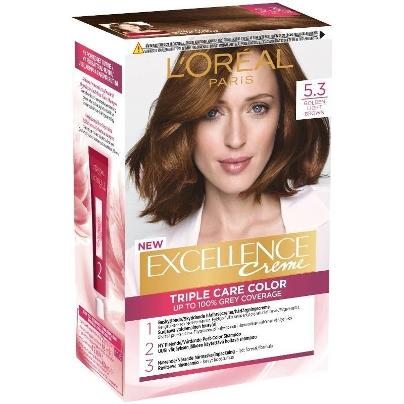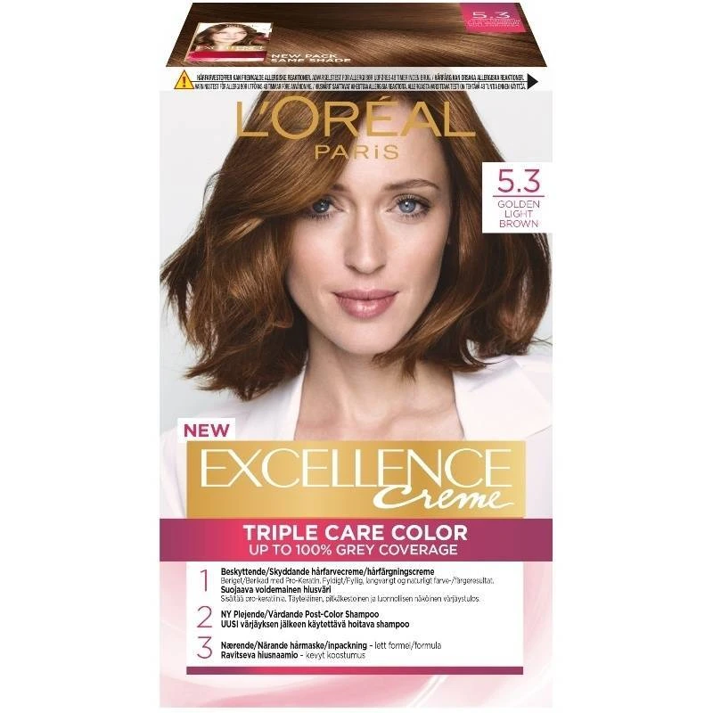 L’Oréal Paris Excellence 5.3 Lysbrun Gylden er en permanent lysebrun hårfarve der er specielt udviklet til, at dække grå hår 100%. Den indeholder Triple Care teknologi, der ved hjælp af Pro-Keratin, Ceramide og Ionéne G komplekser, beskytter før, under og efter hårfarvningen. Dette sikrer en perfekt dækning, samt et glansfuldt og holdbart resultat.