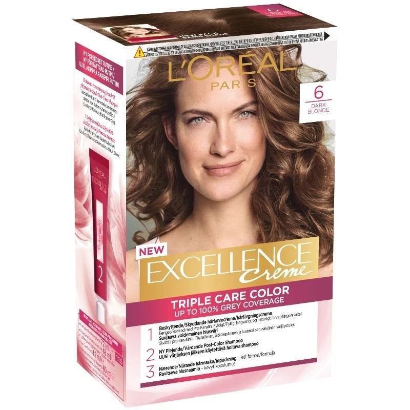 L’Oréal Paris Excellence 6 Mørkeblond er en permanent lysebrun hårfarve der er specielt udviklet til, at dække grå hår 100%. Den indeholder Triple Care teknologi, der ved hjælp af Pro-Keratin, Ceramide og Ionéne G komplekser, beskytter før, under og efter hårfarvningen. Dette sikrer en perfekt dækning, samt et glansfuldt og holdbart resultat.