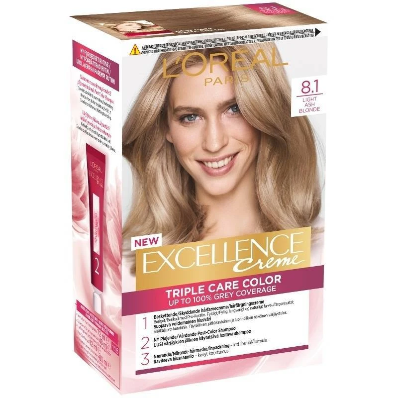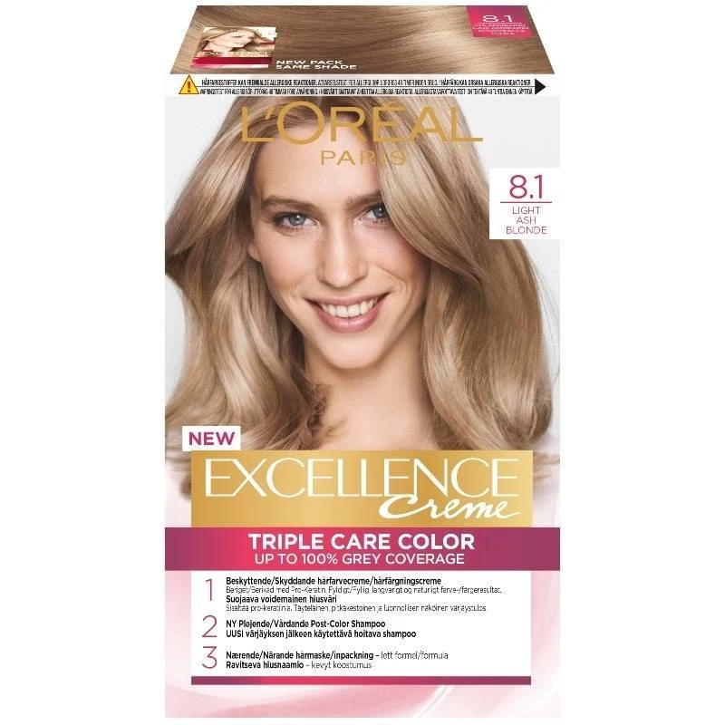 L’Oréal Paris Excellence 8.1 Lysblond Ask er en permanent lyseblond hårfarve der er specielt udviklet til, at dække grå hår 100%. Den indeholder Triple Care teknologi, der ved hjælp af Pro-Keratin, Ceramide og Ionéne G komplekser, beskytter før, under og efter hårfarvningen. Dette sikrer en perfekt dækning, samt et glansfuldt og holdbart resultat.
