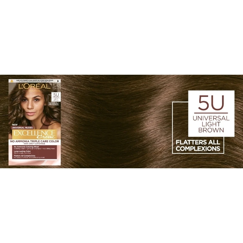 L’Oréal Paris Excellence Universal Nudes – 5U Light Brown er en permanent hårfarve til hjemmebrug, der er specielt udviklet til at kamuflere grå hår op til 100%. Det helt unikke ved denne hårfarve er, at den består af både varme og kolde reflekser, der tilpasser sig til din hudtone og derved kan bruges til alle hårfarver.