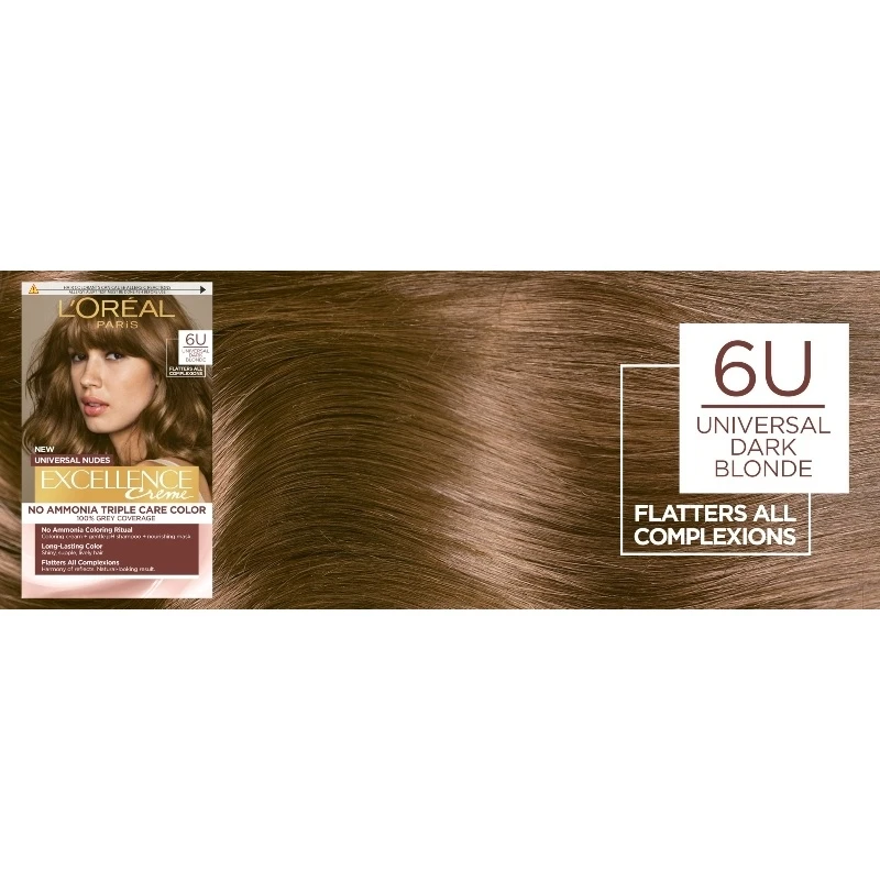 L’Oréal Paris Excellence Universal Nudes – 6U Dark Blonde er en permanent hårfarve til hjemmebrug, der er specielt udviklet til at kamuflere grå hår op til 100%. Det helt unikke ved denne hårfarve er, at den består af både varme og kolde reflekser, der tilpasser sig til din hudtone og derved kan bruges til alle hårfarver.