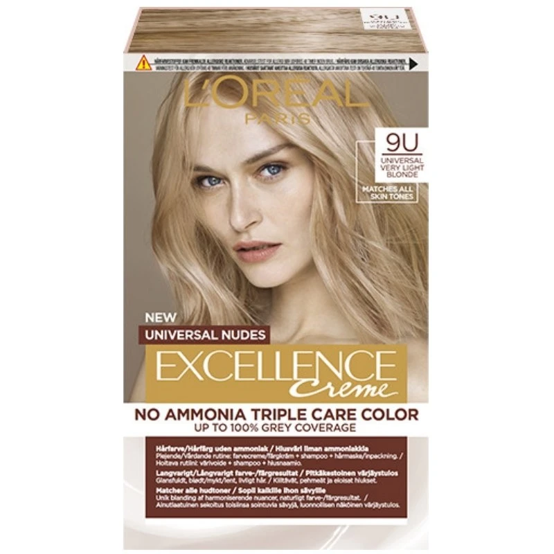 L’Oréal Paris Excellence Universal Nudes – 9U Very Light Blonde er en permanent hårfarve til hjemmebrug, der er specielt udviklet til at kamuflere grå hår op til 100%. Det helt unikke ved denne hårfarve er, at den består af både varme og kolde reflekser, der tilpasser sig til din hudtone og derved kan bruges til alle hårfarver.