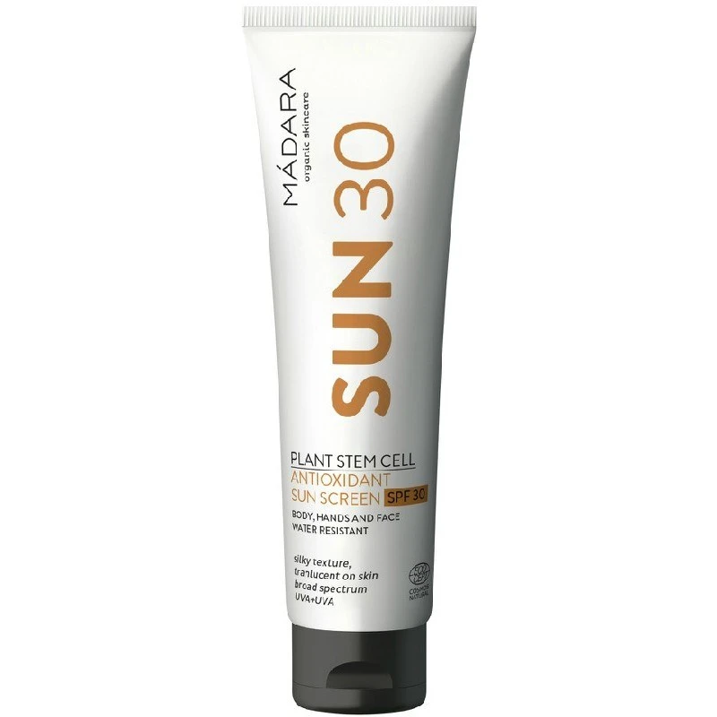 MÀDARA Antioxidant Sunscreen SPF 30 Body, Hand And Face er en fantastisk solcreme til hele kroppen, hvor du ikke går på kompromis med kvalitet eller beskyttelsen. Indeholder stamceller fra nordisk dragehoved, der tilfører huden en dosis af kraftfulde antioxidanter der bekæmper frie radikaler. Beskytter mod aldring og UVA/UVB stråler. Hindbærkerneolie og E-vitamin beskytter huden og styrker den så den står mere modstandsdygtig. Få en super god beskyttelse, en silkeblød konsistens og en skøn duft med denne solcreme, velegnet til alle hudtyper.