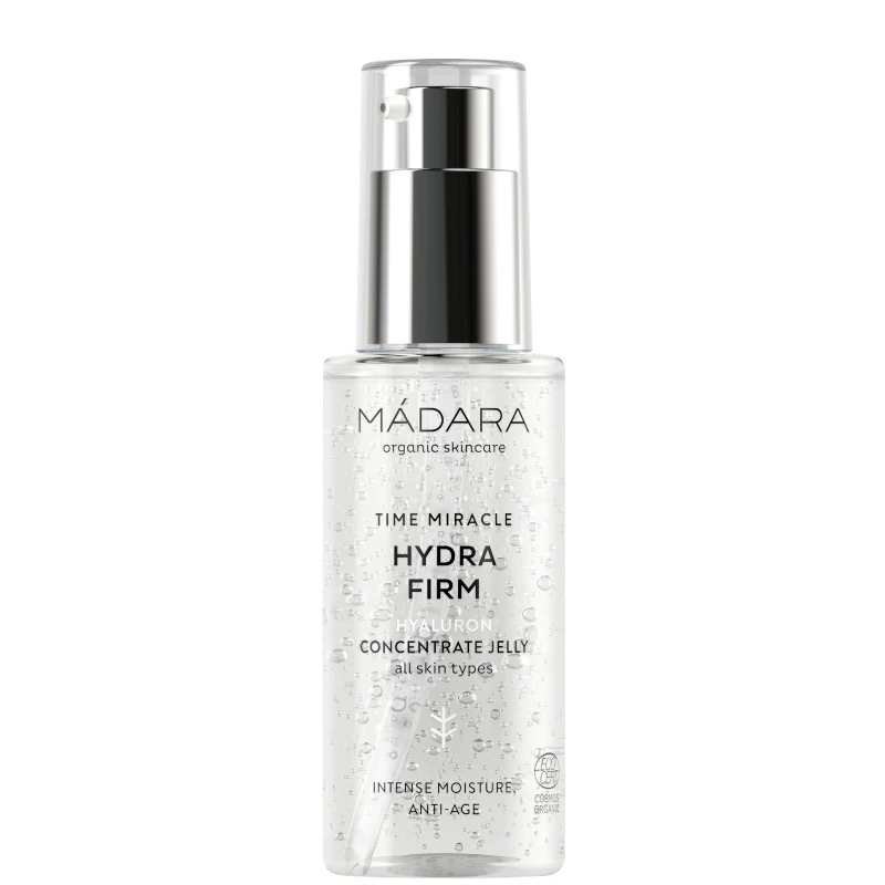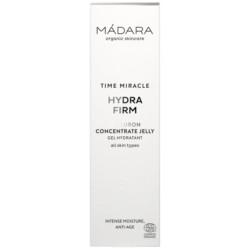 MÁDARA Time Miracle Hydra Firm Hyaluron Concentrate Jelly er beriget med hyaluronsyre, som, i lavmolekylær form, fugter huden i dybden, for at give et glattere og mere fyldigt udtryk, mens de højmolekylære hyaluronsyrer styrker hudens fugtbarriere, så fugt bindes i huden og fugttab mindskes, og øger hudens fugtniveau. Denne gel indeholder også birkesaft, der med sit rige indhold af antioxidanter og aminosyrer, beskytter og udglatter huden, for at mindske ældningstegn, som rynker og fine linjer.