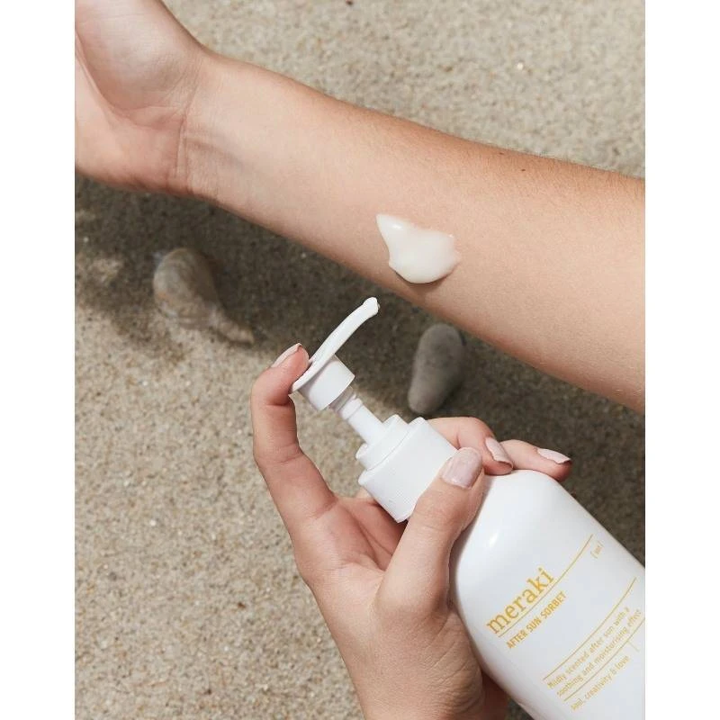 Meraki After Sun Sorbet Mildly Scented er en lækker creme, som ved hjælp fra aloe vera, har en beroligende effekt på huden. Efter en hel dag i solen er det vigtigt at vi sørger for at give vores hud en masse fugt, så den holder sig smidig, men også for at holde på den glød, som solen har givet os. Mandelolien er med til at blødgøre og genskabe hudens elasticitet, mens E-vitamin reducerer de alderstegn, som solen forårsager. Sorbeten trænger hurtigt ind og efterlader din hud glat, samtidig med at en giver en masse fugt og næring til huden, så man slipper for den stramme fornemmelse, som kan forekomme efter flere timers ophold i solen. Derudover virker den kølende, hvilket er super lækkert, da huden godt kan føles varm, når man har været i solen. Meraki After Sun Sorbet har en let blomsterduft med noter af frisk mynte og hvid musk. Den er desuden velegnet til veganere.