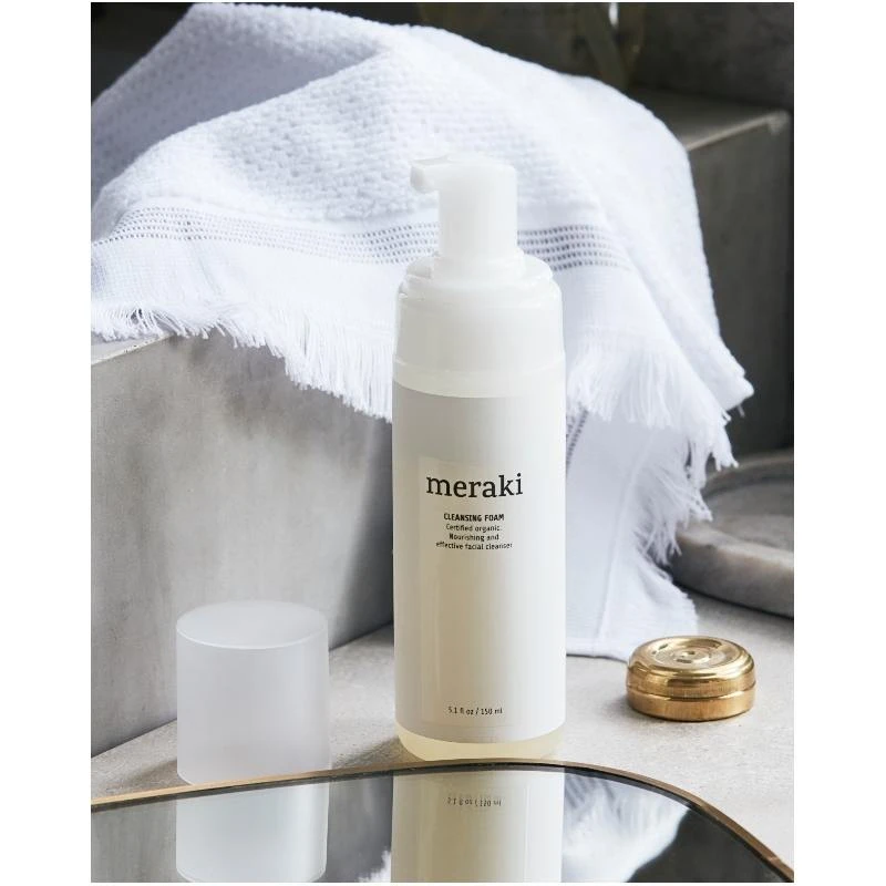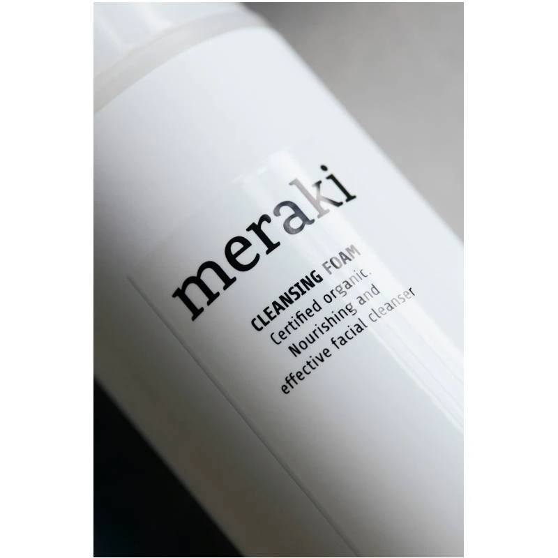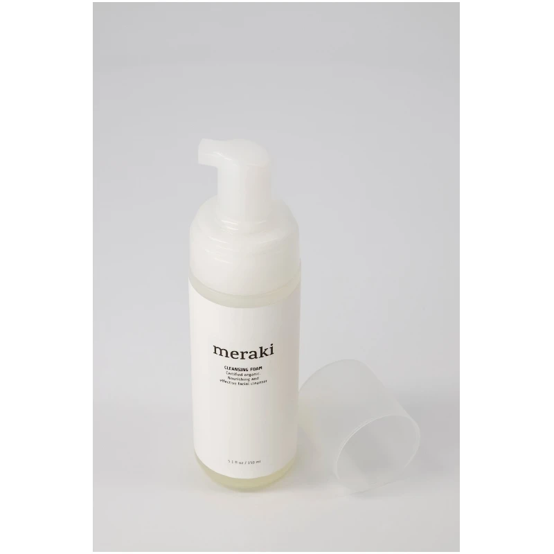 Meraki Cleansing Foam er en yderst mild renseskum, som er velegnet til alle hudtyper. Den blide skum er beriget med fugtgivende aloe vera og hvedeprotein, og den fjerner effektivt urenheder, uden at virke udtørrede på huden. Den rige skum føles super lækkert på huden og det er en fornøjelse at få i ansigtet. Efter brug vil huden være helt ren og med en strålende glød. Meraki Cleansing Foam er ECOCERT mærket og Svanemærket.