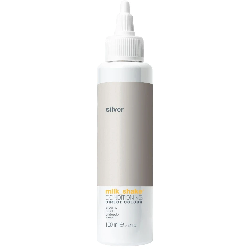 Med Milk_shake Conditioning Direct Colour – Silver får du en moderne kold lysegrå hårfarve. Direct Colour farvesystemet, er ikke uden grund, blevet mange frisører og forbrugers favorit. Denne plejende farve, er rig på pigmenter og giver dig mulighed for at opfriske din farve, indfarve den i en koldere eller varmere nuance, eller være kreativ og lege med de mange pang farver. Farvebehandlingen holder i op til 8-10 hårvaske, alt efter hårets tilstand, tykkelse og grundlag.
