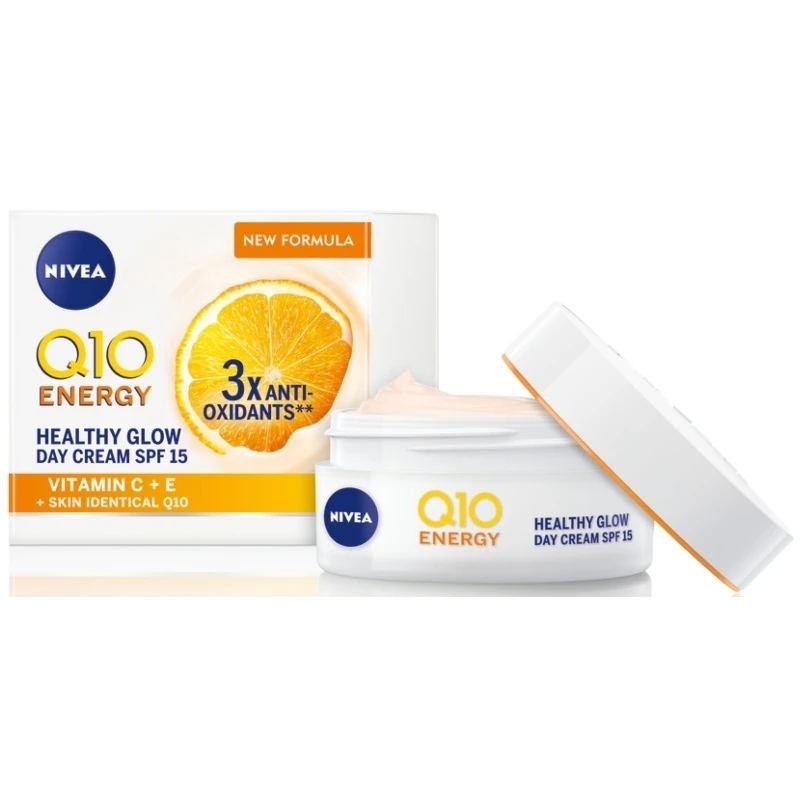 Nivea Q10 Energy Healthy Glow Day Cream SPF 15 – er en anti-aging dagcreme, som er specielt udviklet til kvinder i alderen 25+. Det er omkring denne alder, man skal begynde at tænke på anti-age, selvom det for mange lyder til at være tidligt – dog skal man tænke på, at det altid er bedre at forbygge end at begynde at arbejde på linjer og rynker, når først skaden er sket. Denne creme er beriget med gojibær, som vækker huden, og som derved mindsker tegn på træthed, samtidig med at den bekæmper linjer og rynker indefra. Cremen er desuden med faktor 15, som beskytter mod UVA stråler, som også er en faktor, der spiller ind, når der snakkes linjer og rynker. Den fugter huden i op til 24 timer, og giver en frisk og lækker glød. Kom rynkerne i forkøbet med Nivea Q10 Energy Healthy Glow Day Cream SPF 15.