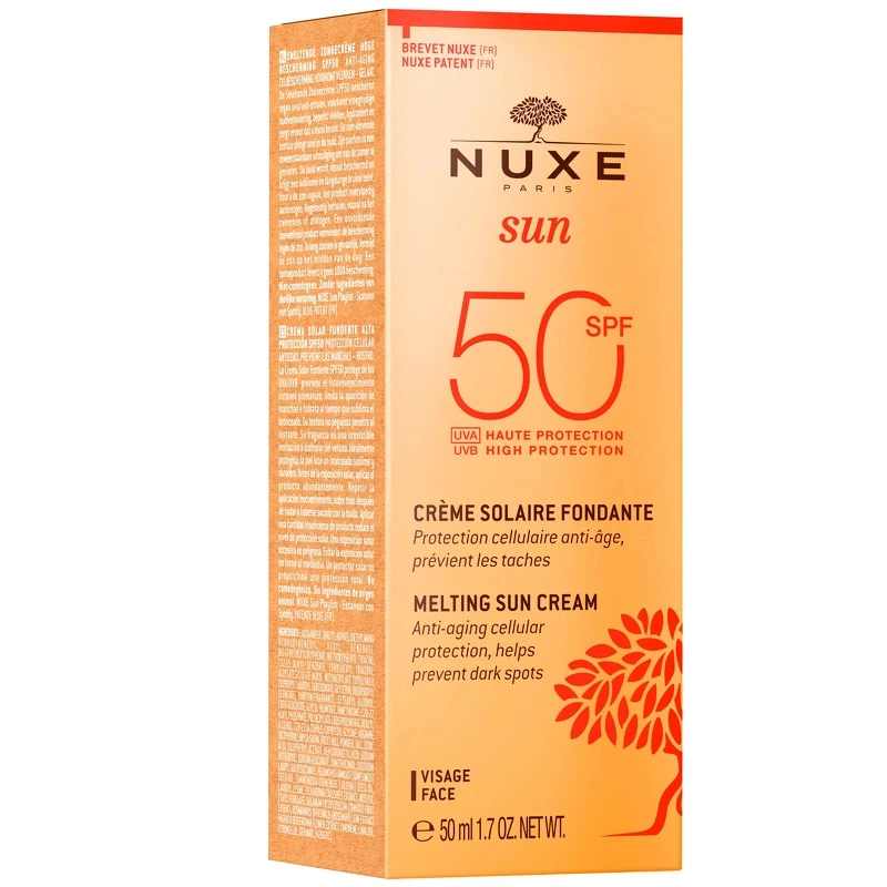 Nuxe Sun Melting Cream High Protection SPF 50 er en solcreme til ansigtet. Den beskytter ikke kun huden mod solens skadelige stråler, men også mod for tidlig ældning, som kan kommer af for meget sol. Den fugter huden, og har en beroligende virkning. Cremen har en let konsistens, som ikke fedter huden, og som hurtigt absorberes. Nuxe Sun Melting Cream High Protection SPF 50 er med til at give en ensartet kulør, og modvirker samtidig mørke pletter i huden.