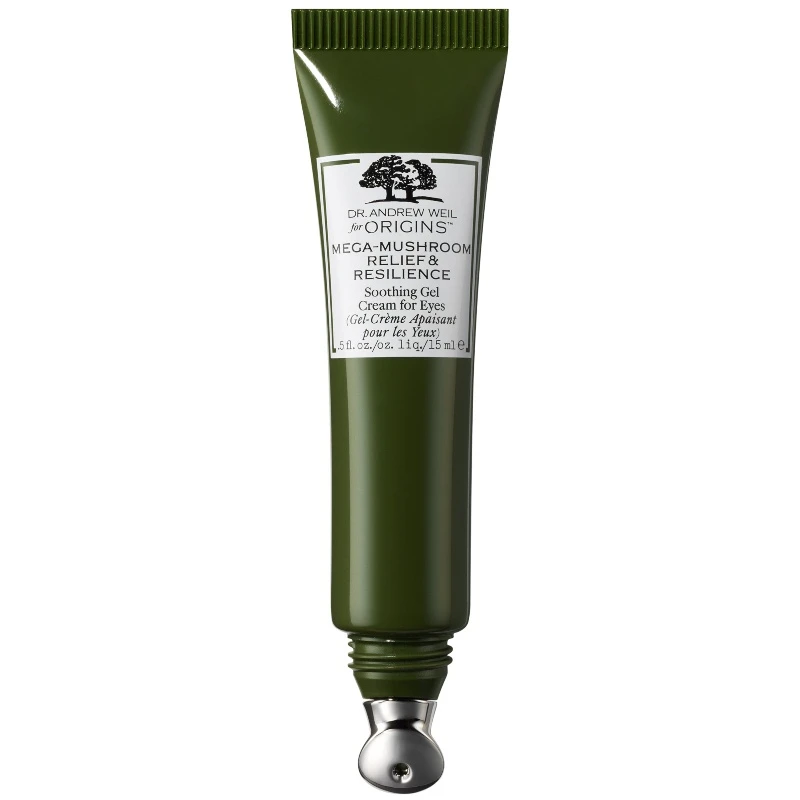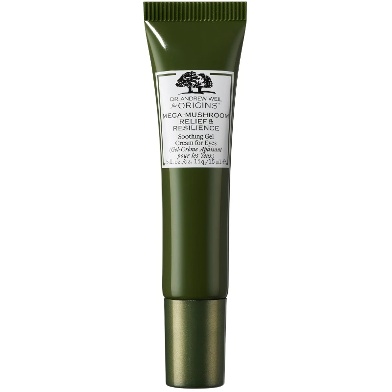 Origins Dr. Weil Mega-Mushroom™ Relief & Resilience Soothing Gel Cream for Eyes er en øjencreme, der har til formål at beskytte og pleje det følsomme område omkring øjnene. Den har en lindrende formel, der virker fugtgivende og medvirker til at reducerer synlige tegn på træthed og irritation. Formlen indeholder reishi-svampe og marietidsel, som tilfører fugt og modvirker mørke rande og rødme. Ved et enkelt tryk på tuben får man cremen ud på applikatoren, som virker kølende, og er perfekt til at massere cremen ind med for at stimulerer mikrocirkulationen.