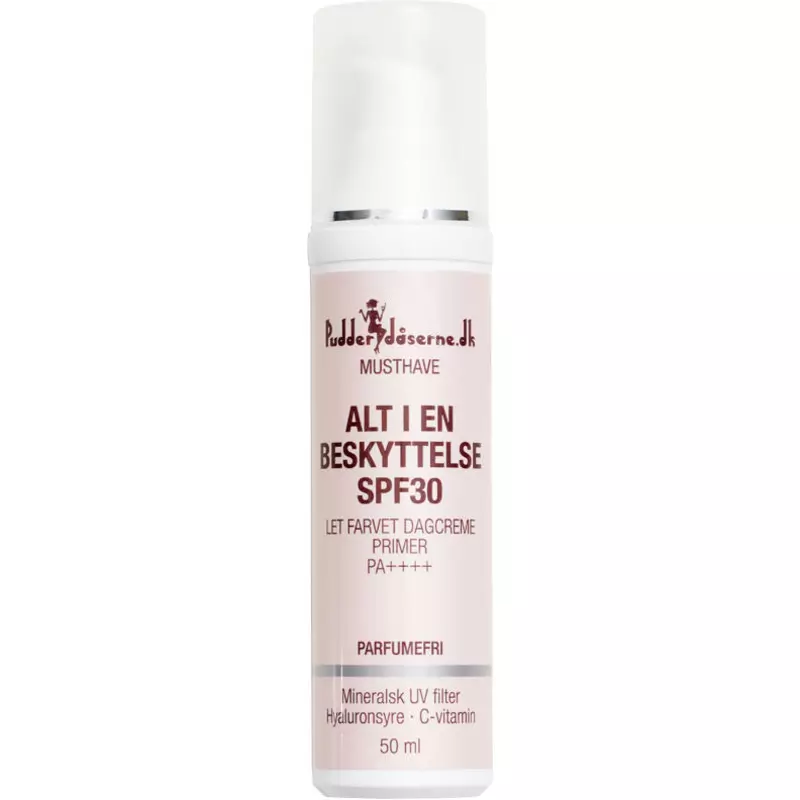 Pudderdåserne Alt I En Beskyttelse SPF 30 er en yderst skøn farvet dagcreme, som både kan bruges som en dagcreme, primer, let makeup eller en solcreme til ansigtet.