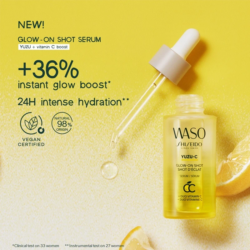 Shiseido WASO Yuzu-C Glow-On Shot Serum er et superlækkert serum, som giver din hud masser af fugt og en smuk glød. Dette tofasede serum indeholder yuzuekstrakt og en kombination af superfoodolier fra vindruekerner, hyben og solsikker, som holder huden intensivt fugtet i op til 24 timer, så den bliver dejlig blød og får en flot, naturlig udstråling.
